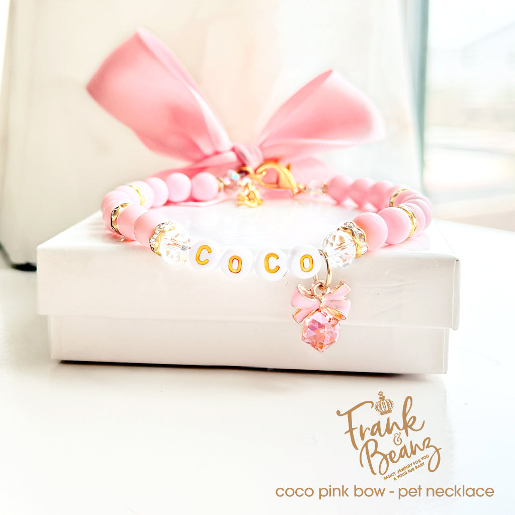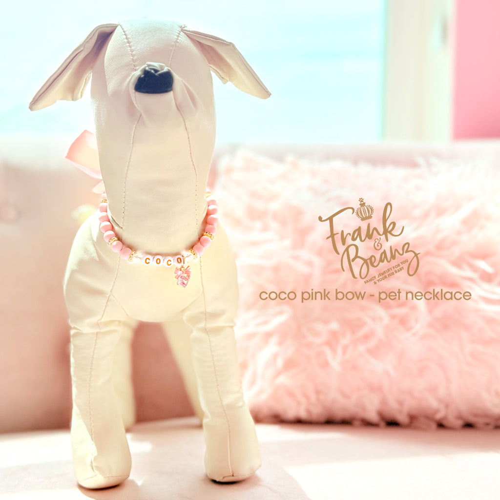 Pink Bow Crystal Gem Pet necklace is handmade with pink beads that are lightweight so it sits comfortably on your fur baby's neckline.