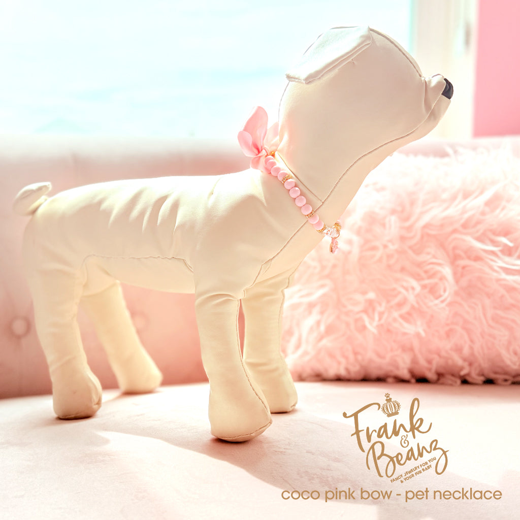Pink Bow Crystal Gem Pet necklace is handmade with pink beads that are lightweight so it sits comfortably on your fur baby's neckline.
